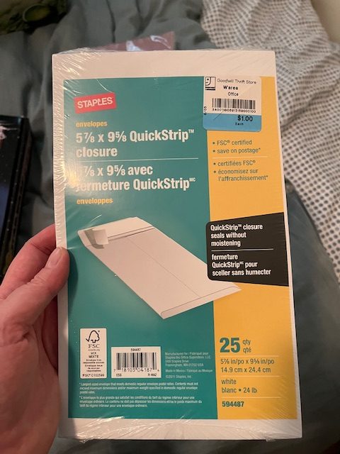 See what I’m talking about? And the crazy thing was that Goodwill had a pack of 100 available too. Can’t remember the price right now, but I remember that this seemed the better bargain overall. And I only, frankly, wanted to spend a dollar on envelopes. 😉