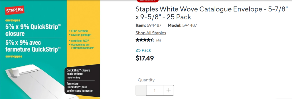 - Staples 5 7/8 x 95/8″ Quickstrip closure white envelopes $1.00